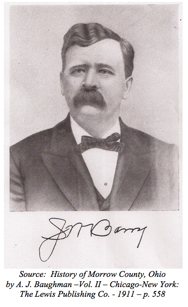 interests. Hiram Barber is a native son of Westfield township, Morrow county, Ohio, and the date of his nativity is December 9, 1853. Mr. Barber on the paternal side traces his lineage to the French, and the original spelling was “Barbour.” On the maternal side he traces his lineage to the Spanish. He is a son of James L. and Elizabeth (Benedict) Barber, both of whom were born and reared in the state of New York, where was solemnized their marriage and whence they came to Morrow county, Ohio, at an early day, location being made on the farm on which the subject of this review now maintains his home. James L. Barber received his educational training in the public schools of the old Empire state and he was engaged in agricultural pursuits during the major portion of his active business career. He and his wife became the parents of eight children, and of the number four are living in 1911. The father was summoned to the life eternal in November, 1861, and the mother passed to the great beyond on the 14th of May, 1899. After completing the curriculum of the public schools of Westfield township, Hiram Barber, at the age of fifteen years, became actively identified with the work and management of the home farm. His parents died when he was a mere youth and he was thus forced at an early age to assume the responsibilities and cares of life. He and his brother Melvin, ran the home farm until Hiram had attained to his legal majority, at which time he was married. Thereafter removal was made to the present fine estate of one hundred and forty-four acres, sixty-two of which belong to Mrs. Barber. The farm is eligibly located seven miles distant from Cardington and everything about the place indicates thrift and a high degree of prosperity. Mr. Barber is engaged in diversified agriculture and the raising of high grade stock and he is conceded to be one of the most successful and influential farmers in the township, where he is held in high regard by his fellow citizens. On the 30th of January, 1874, was solemnized the marriage of Mr. Barber to Miss Mary E. Foust, who was born in Westfield township on the 16th of October, 1854, and who is a daughter of Wilson Foust. Mr. and Mrs. Barber have six children, concerning whom the following brief data are here recorded. Della is the wife of Clay Curren, of Westfield; Luetta, who is now Mrs. L. L. Sharp, was educated in the schools of Westfield and she was a teacher prior to her marriage; Bruce B., who was graduated in the Ashley High School and in the Starling Ohio Medical College, with the degree of Doctor of Medicine, in 1911, is now engaged in the active practice of his profession at Columbus, Ohio. Dr. Barber is both a Mason and a Knight of Pythias, and is a member of the college fraternity Alpha Kappa. Myron H., married Ada McLead and they reside in Trumbull County, Ohio; James W., after completing the prescribed course in the Ashley High School, attended the Columbus Business College, at Columbus, Ohio, and he is now a popular and successful teacher at Westfield; and Carrie, who was likewise graduated in the Ashley High School, is also engaged in the pedagogic profession at Westfield. Another child, Miss Mayme Nell Barber, was born September 23, 1885, and died at the place of her birth, Westfield, Ohio, August 22, 1908, aged twenty-two years, ten months and twenty-nine days. Her illness was of short duration, dating back only three weeks previous to her death, when she was taken sick with typhoid fever. Mayme was of unusually kind and affectionate disposition, self-sacrificing in her nature, especially in the home circle, where she will be sadly missed. She graduated with honors from the Ashley High School in the class of 1904. She was a consistent Christian young lady and had many virtues of mind and heart that endeared her to all that knew her. She was converted in the Westfield Methodist Episcopal church during the winter of 1903, under the pastorate of the Rev. Gray, and was an acceptable member of the church. In June, 1905, she was elected president of the Ladies Aid Society and fulfilled her duties in that capacity in a very acceptable manner. Although young in years she seemed to have the judgment of more mature years and was interested in everything that pertained to the church. The funeral occurred on Tuesday, August 25th, at 2:00 o’clock, and was very largely attended by a host of relatives and friends. Accompanied by the strains from the organ played by Miss Ruth Olds, six young ladies of the class of ’04, preceeded [sic] the casket into the church, carrying flowers. After the reading of the scripture lesson and prayer, the choir sang a selection, after which the obituary was read. Then Mrs. Elizabeth Wilt Wornstaff, of Ashley sang very sweetly, “I heard the voice of Jesus say.” After the sermon the services closed by the choir singing “Jesus Lover of my soul.” The services were beautiful and impressive and were conducted by Rev. Gray, of Caledonia, with burial at Marlboro. The Pythian Sisters, of which she was a member, attended in a body and had charge of the services at the cemetery. She leaves a father and mother, three brothers and three sisters to mourn. In his political convictions Mr. Barber is a stalwart supporter of the cause of the Republican party, and while he has never had a great deal of time or ambition for political preferment he has given most efficient service as township assessor and as a member of the local school board. In a fraternal way he is a member of Ashley Lodge, No. 457; Knights of Pythias, and his wife is a member of Good Hope Temple of the Rathbone Sisters, No. 266. Mrs. Barber is a valued and appreciative member of the Order of the Eastern Star, No. 147. Mr. Barber is an intelligent, broad minded man, of courteous demeanor, and thus far his career has been one of great activity and signal usefulness. He bears an unsullied reputation in business and social circles and his honesty and integrity
